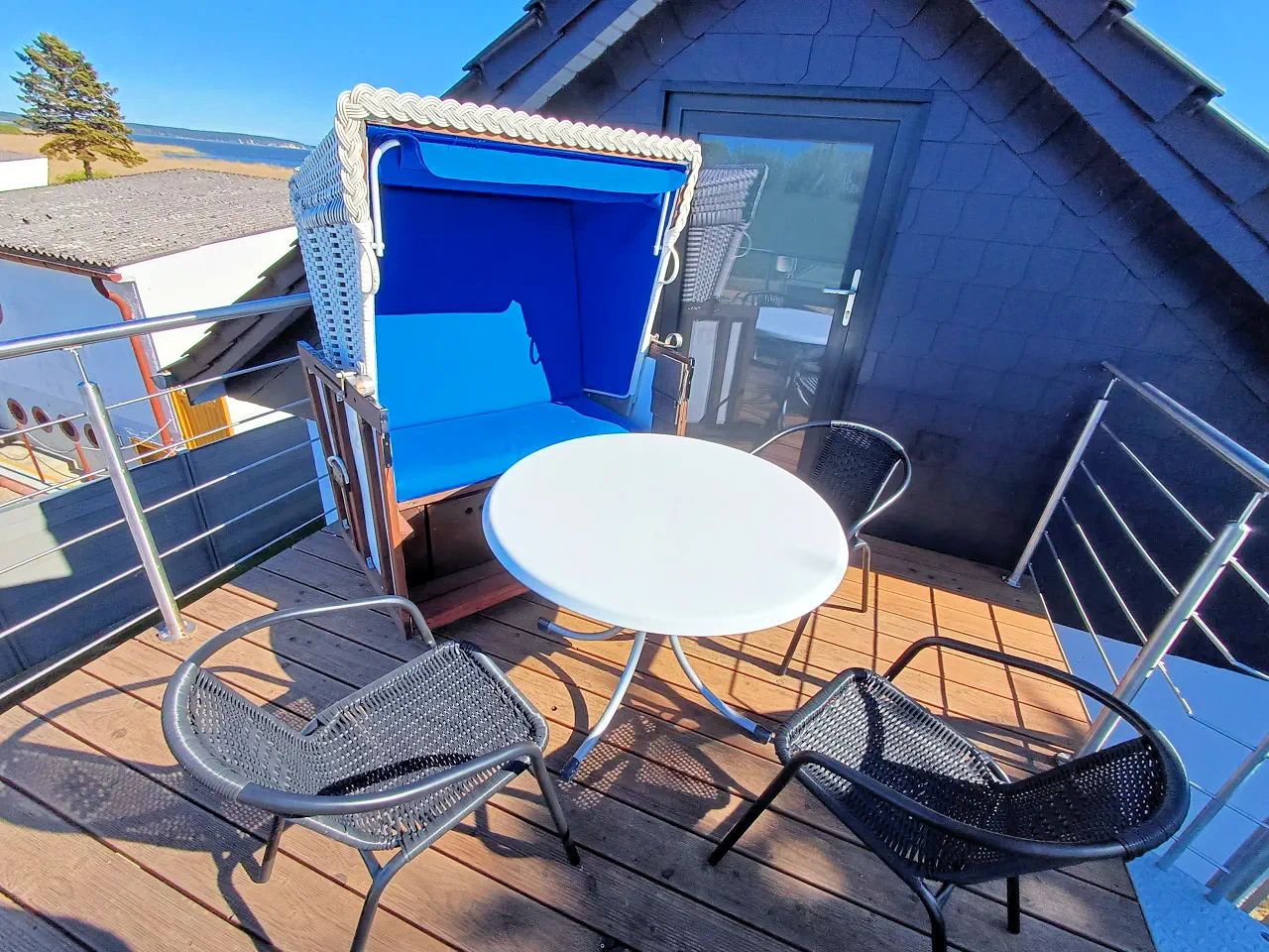 Auf der ca. 9 qm großen möblierten Terrasse mit Strandkorb können Sie morgens Ihren Kaffee genießen oder den Abend bei einem Glas Wein ausklingen lassen.